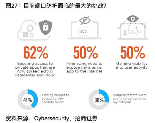 目前端口防护面临最大的安全挑战是什么?据Cybersecurity数据,62%的企业认为,是保护重点在于对当下分布在数据中心和云上的私有应用的访问;50%的企业认为,需要缩小面向互联网开放的内部应用程序;50%的企业认为,需要强化捕捉用户内部活动的能力。