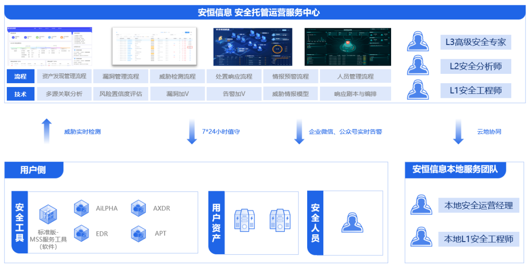 威胁实时检测与处置响应:云端服务专家实时监测网络安全状态,持续分析检测接收到的信息和行为,从各个维度综合发现漏洞、弱密码等安全风险和 Webshell 写入、异常登录、异常网络连接、异常命令调用等异常行为,并可通过微信、钉钉、邮件等方式主动通知用户,在服务频率内获取授权后采取行动,借助本地或远程部署的相关安全工具完成查杀、封锁等处置。注:对于服务套餐外的资产,提供查杀方法和处置建议。