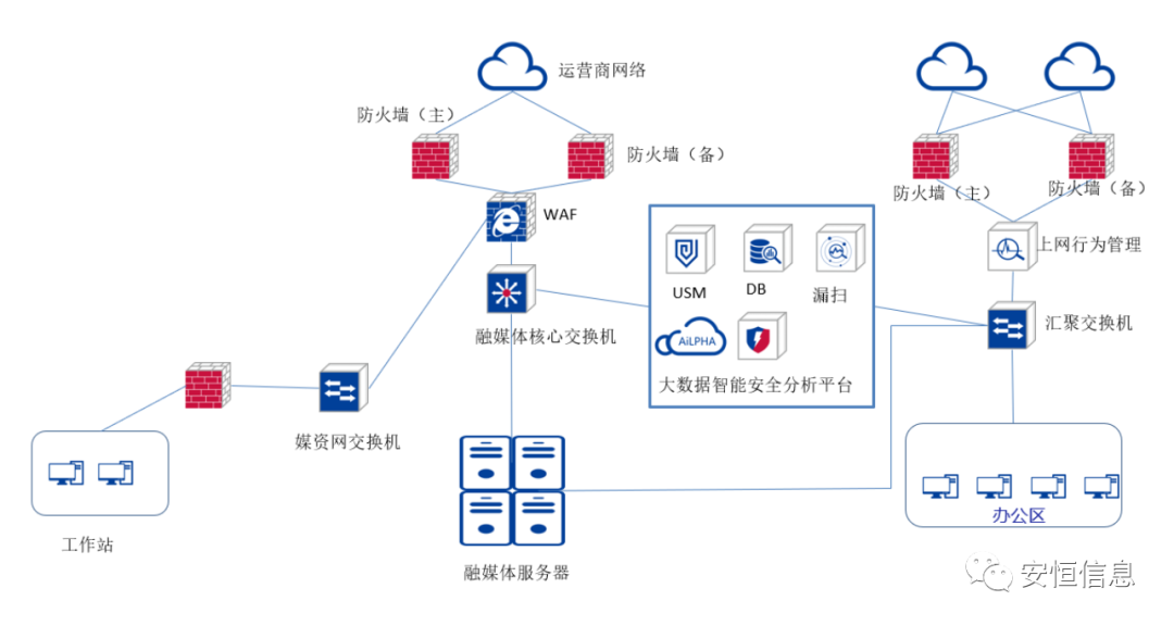 媒体是信息传播的重要窗口与渠道,在数字时代,无论是电视台制播网的运行,还是融媒体中心网络与互联网的互联互通的应用,都离不开网络安全防护的保驾护航。安恒信息作为网络安全多年的践行者与创新者,专注于多领域筑牢安全防线。未来,安恒信息也将为融媒发展提供更安全、更有利的技术支撑,为营造安全优质、稳定可靠的播出传播环境而不懈努力!