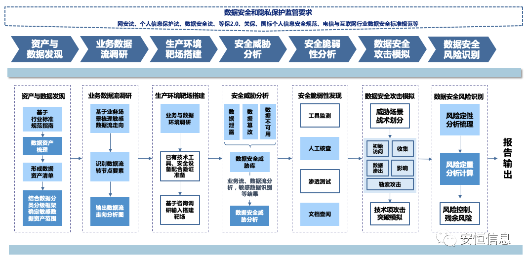 安恒信息深耕数据安全领域多年,在对金融、政府、国企等行业的数据安全风险研究和评估方面积累了丰富的实战经验,关于数据安全风险评估开展工作,将采取以下7步走的动作进行开展: