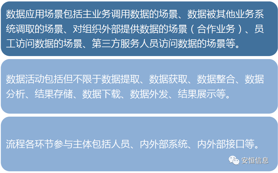 ● 数据一旦生产出来后就会进入传输、存储、处理、分析、访问与服务应用等各环节且循环往复,重要数据在流动过程中,会产生大量的接触和交互。如内部的研发和运营管理角色,服务器、云平台、大数据处理与分析系统中的流动,与众多伙伴、客户等进行互动和推送,涉及面异常广泛。