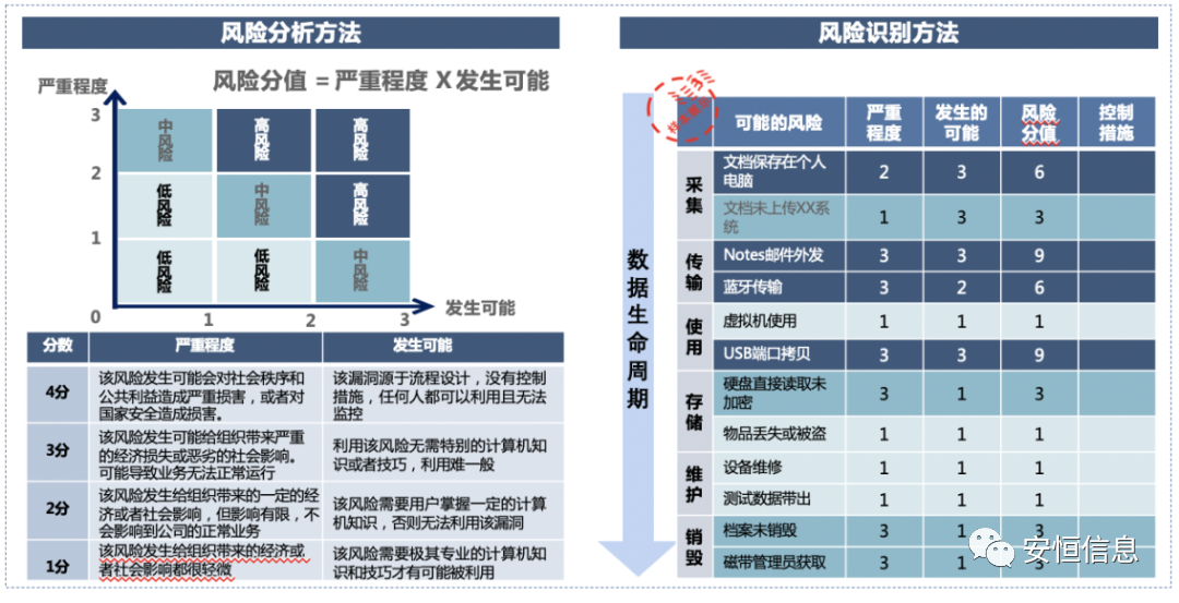 最后以数据安全咨询以及攻击模拟的结果,分析基于业务场景的数据全生命周期过程中存在的风险,通过定性分析展现风险严重程度以及分析可能性,通过定量计算输出风险分值,综合得出数据安全风险评估结果。