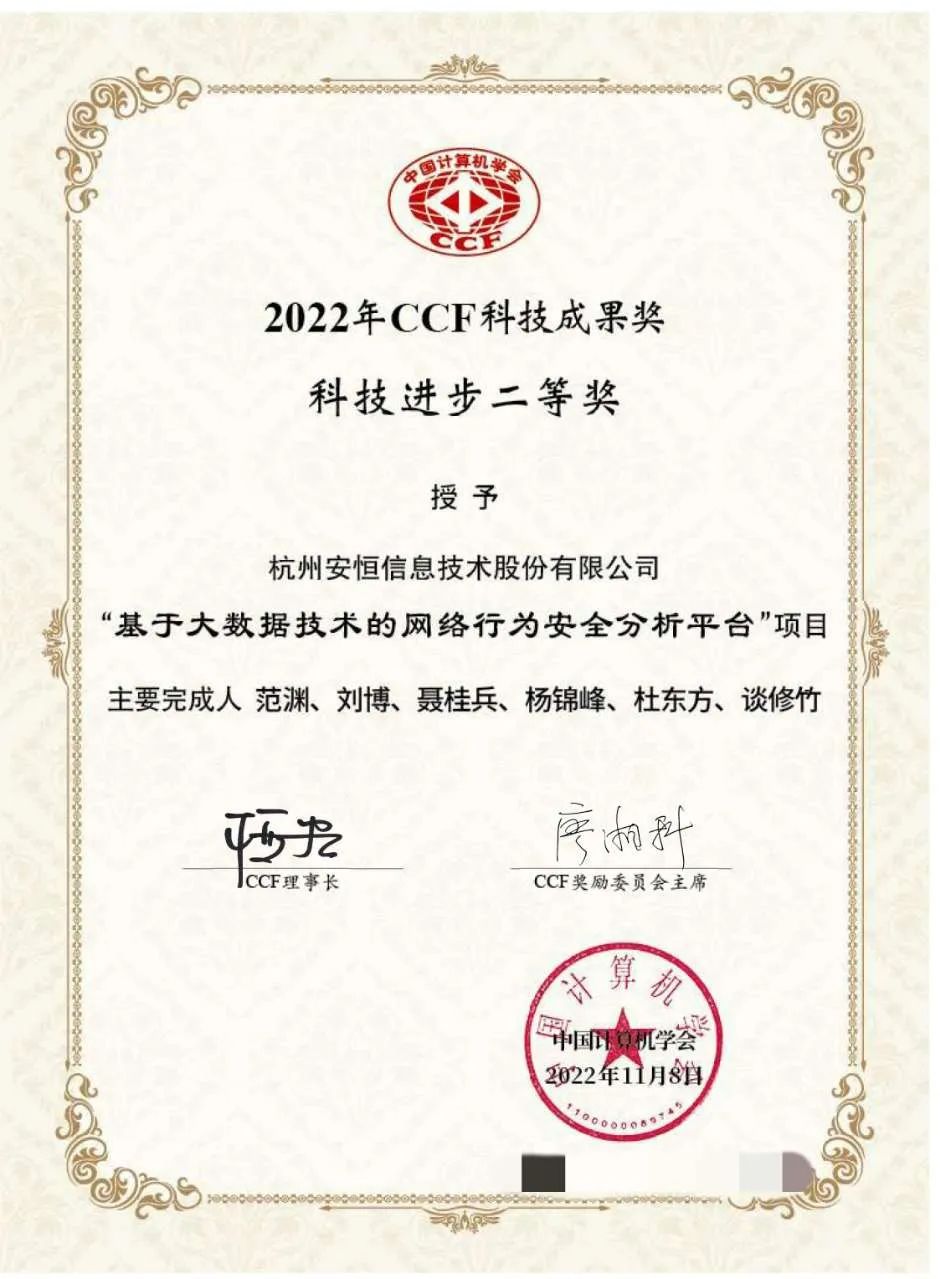 近日,中国计算机学会(CCF)发布了2022年度“CCF科技成果奖”评选结果,全国仅有30个项目获奖。安恒信息申报的“基于大数据技术的网络行为安全分析平台”项目荣获科技进步二等奖。这项科技界权威奖项是对安恒信息创新实力的再次肯定。