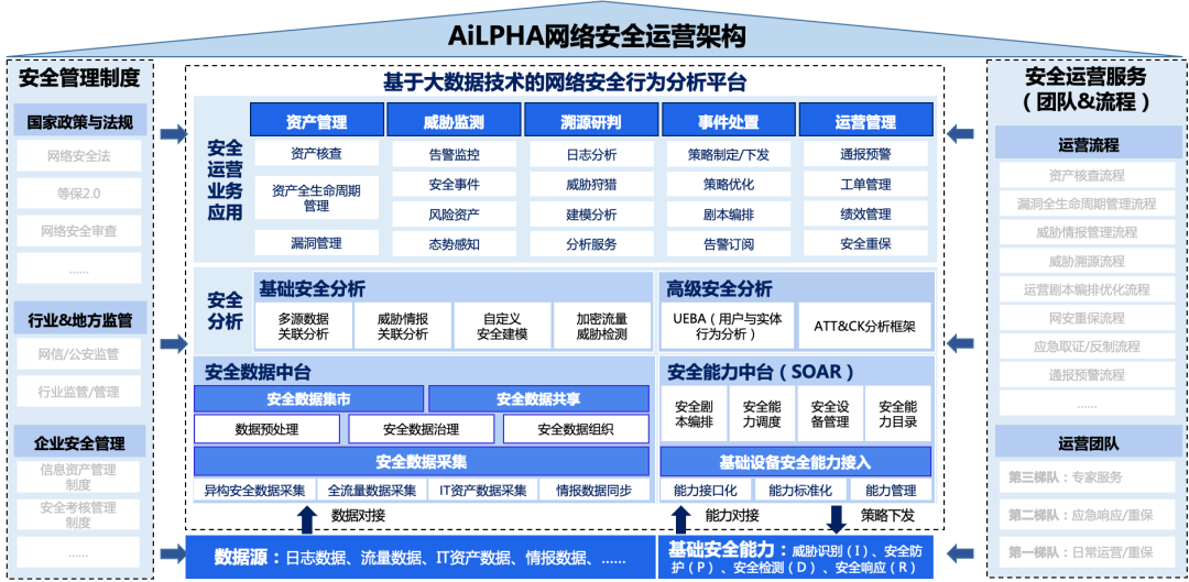 随着企业信息化的不断发展,逐渐呈现出人机物深度融合的网络空间环境,这其中存在设备多样异构、行为多跨场景、边界多态模糊、威胁多源重构等复杂化趋势,网络攻击面被无限放大。因此,研究利用大数据、云计算、人工智能等赋能“技术对技术、技术管技术”的安全威胁治理,解决攻防对抗能力不对称难题,成为网络强国必争的技术高地。具体而言,如何统一处理设备端多源异构海量日志数据、如何政企企业全网络行为的预警分析、如何对网络攻击行为进行自动化关联推理以及如何对发生的安全事件进行快速阻断等,是当前安全威胁治理面临的四重技术难题。基于此,我们提出利用大数据、人工智能等技术实现网络安全平台类产品,为政企构建体系化安全运营方案。