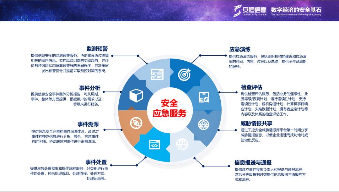 安恒信息可为行业客户提供全方位工控安全应急服务。在发生突发/重大信息安全事件时,第一时间提供工控信息安全应急响应,帮助客户尽可能减小和控制信息安全事件造成的损失,并提供有效的响应和恢复指导。