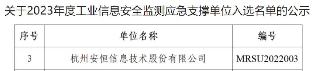近日,国家工业信息安全发展研究中心发布《关于2023年度工业信息安全监测应急支撑单位入选名单的公示》,这是中心整合现有工业信息安全监测网络建设支撑机构、工业信息安全应急服务支撑单位为工业信息安全监测应急支撑单位后评选的首批支撑单位,安恒信息成功入选。 继首批入围工业信息安全应急服务支撑单位、首批入围工业信息安全监测预警网络建设支撑机构后,安恒信息持续在支撑国家工业信息安全事件处置、监测预警网络建设中积极贡献力量,技术实力和社会责任感再次得到高度认可。