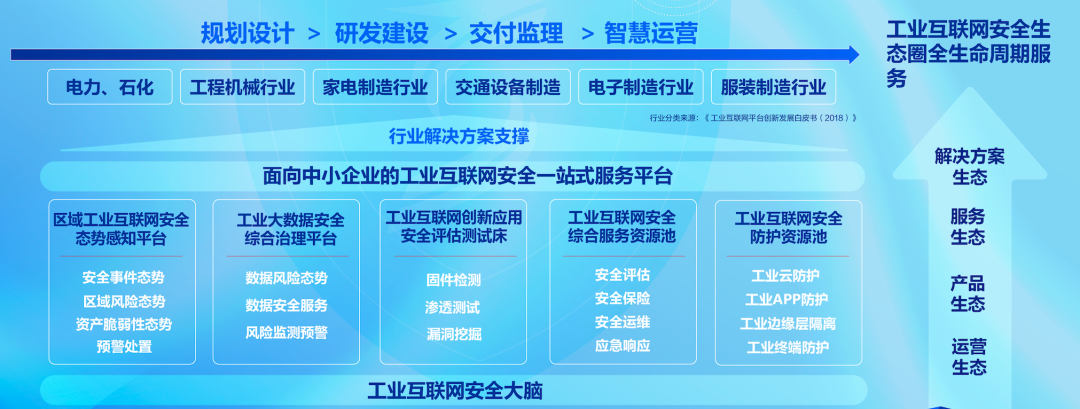 针对中小企业的网络安全困境,安恒信息工业互联网安全一站式服务平台通过集成丰富的工业互联网场景安全能力,提供一站式的安全服务,形成天然的工业互联网安全能力资源池。平台响应工业互联网安全管理分类要求,从设备、控制、应用、网络和数据五个维度出发,实现安全防护规划与部署、安全监测感知与分析、安全响应与处置恢复、生态交付等功能的管理与服务,满足工业互联网场景下联网企业和平台企业的多种个性化安全建设需求。