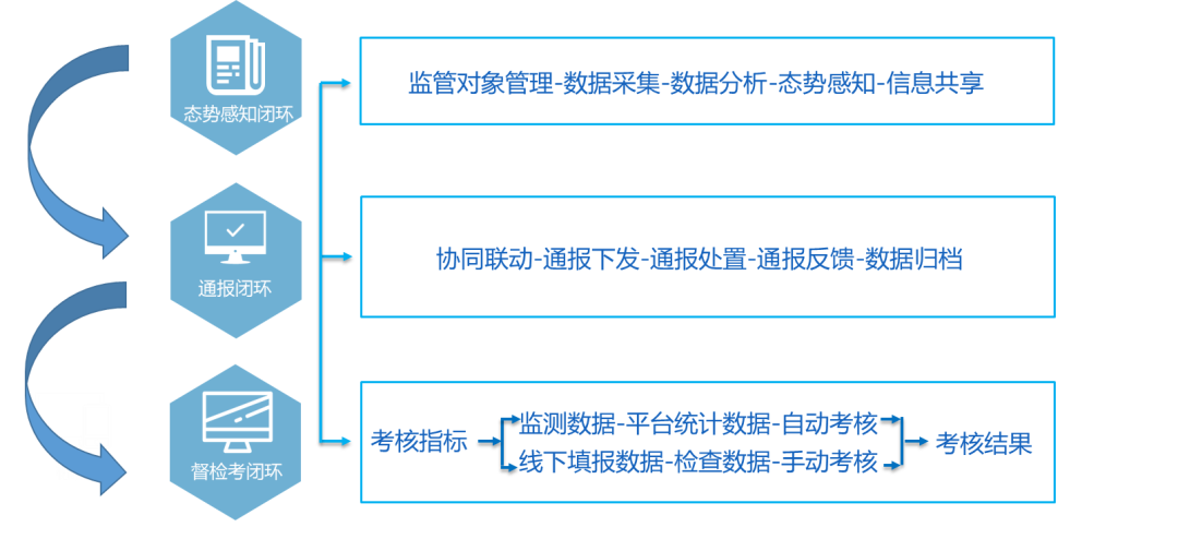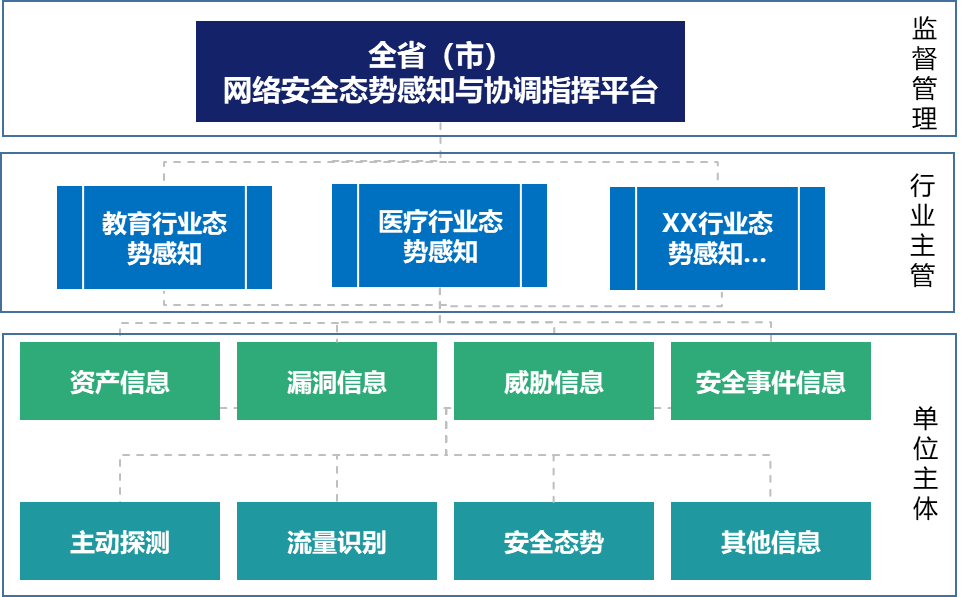 以某教育厅为例,行业主管部门建立全省教育行业的信息收集、监测预警、分析研判、通报预警机制,监管省内高校、在线教育、下级教育局等单位安全态势;省网信部门态势感知平台则建立与各行业态势感知平台之间的信息共享与协调联动机制,建立监督、检查、考核机制,推动实现落实网络安全工作责任制,压实网络安全主体责任。