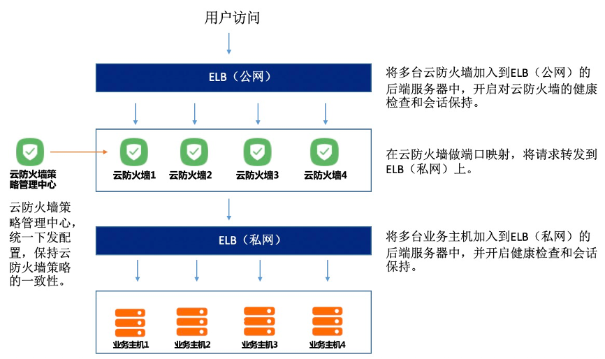 多台云防火墙上给ELB(私网)做端口映射,转发流量到ELB(私网);