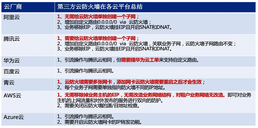 由于云防火墙是属于流量型安全产品,其最大痛点在它部署完成后,如何将云主机的流量引入到云防火墙上进行安全防护,此为一大技术难题。安恒云结合多年云上最佳安全实践经验,将分别介绍第三方安全厂商的云防火墙如何在阿里云、腾讯云、华为云、百度云、青云、AWS云和Azure云完成引流。(备注:排名不分先后)同时也会介绍如何利用云原生的能力满足云防火墙的高性能、高可用需求。