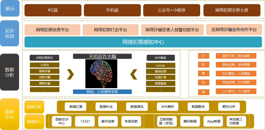 方案以网站封堵和潜在受害者精准识别预警为核心,构建全民参与、警企合作、部门协调的打防管控宣一体化的反诈平台,最终实现对辖区网络诈骗的打、防、管、控、宣。
