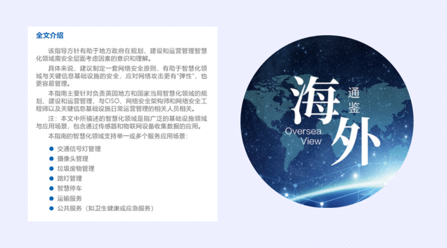 本期特收录独家翻译的《网络专家眼中未来智慧城市安全指南》,内容由英国政府通信总部下属英国国家网络安全中心(NCSC)发布,从海外视角了解未来智慧城市的规划思路,吸收先进经验,因地制宜,更好地投身智慧城市的安全建设中去。