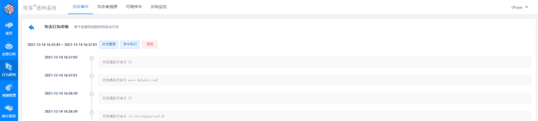 高交互的特性则使它能诱导攻击者持续攻击,捕获更多攻击行为,并分析溯源得到高精准度的攻击者相关信息,轻松定位攻击者。