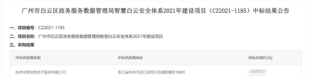 安恒信息专注于国内网络信息安全领域,是智慧城市安全等前沿领域的领军企业之一。此次中标后,公司将依托专业产品和优势技术,协助白云区政务服务数据管理局等相关部门做好“智慧白云”网络和数据安全保障工作;通过提供全方位安全能力输出,支撑白云区政务云、政务数据共享开放、关键信息基础设施保护等业务的有序开展,共同打造具备主动防御和协同运营能力的安全保障体系,整体提升智慧白云网络安全保护能力。