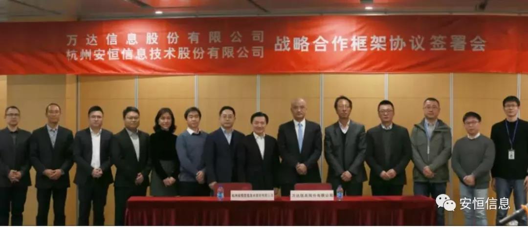 今年1月9日,万达信息与安恒信息签署战略合作协议,正式达成战略合作关系。此后,双方在智慧城市、信息安全、网络安全保险等领域开展了稳定、互利的整合合作。合资公司的成立是双方在此基础上,为进一步推动战略合作落地与升级的深度融合,共同为用户提供领先的产品和服务解决方案,为推动智慧城市和数字经济产业发展贡献力量。