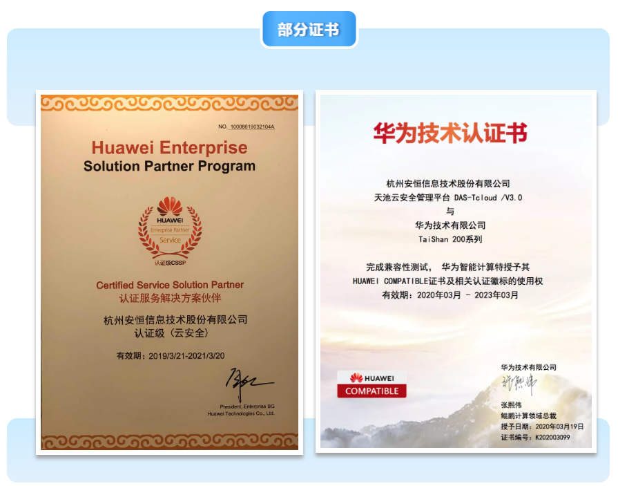 天池云安全管理平台率先和鲲鹏服务器进行了全方位的适配工作,这也是国内第一个完成与鲲鹏服务器全面适配的云安全资源池及管理平台产品。天池云安全管理平台支持与鲲鹏云全面深度融合,把天池的云安全资源池的能力全面赋能给鲲鹏云。基于全面的安全能力,安恒信息成为华为认证的企业级解决方案合作伙伴(云安全)。