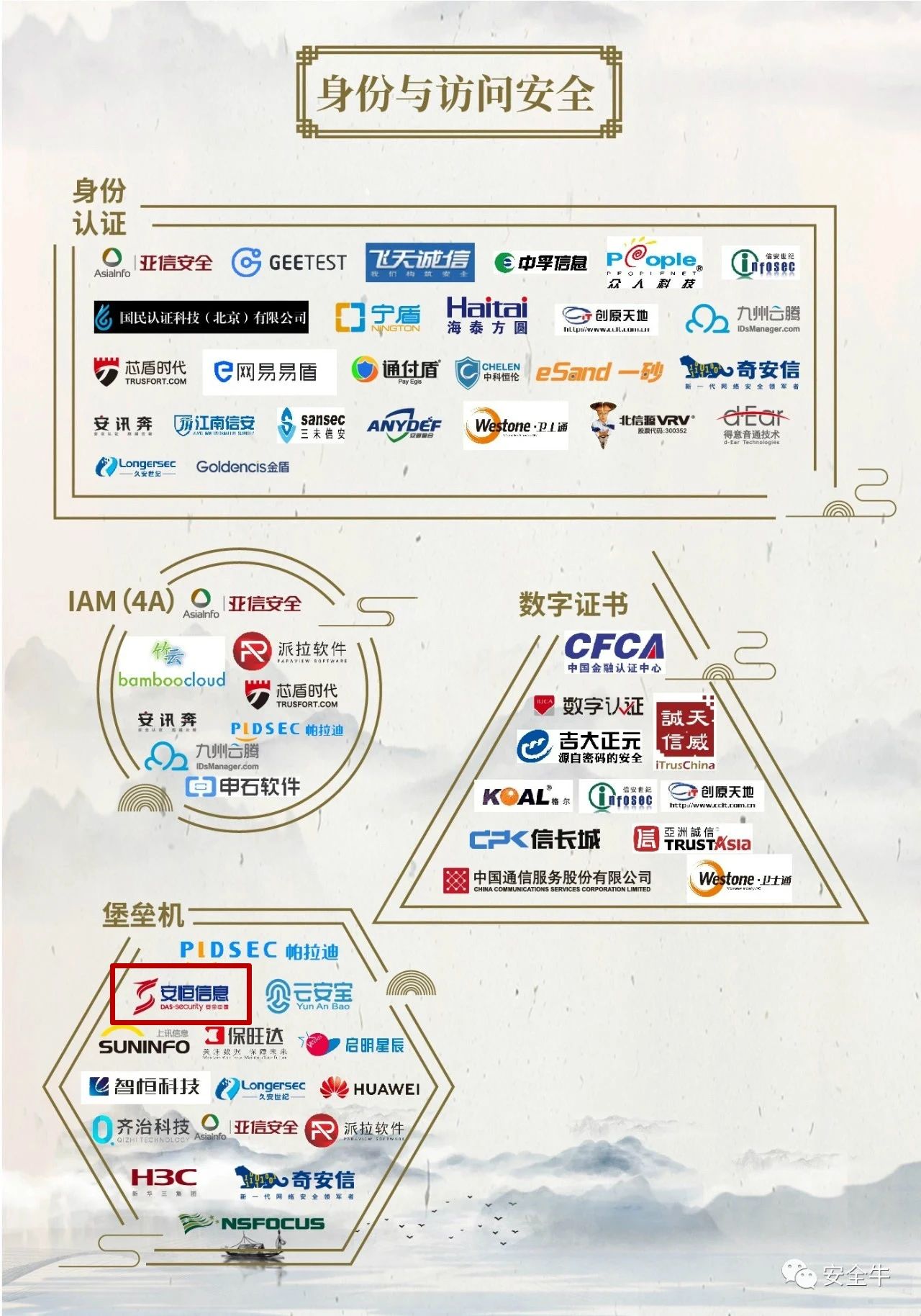 安恒信息入围了其中11类一级安全领域29类二级细分领域:终端检测与响应、数据平台安全、堡垒机、网络流量管理、访问控制、web应用防护(WAF)、web应用扫描与监控、网页防篡改、审计与日志(SIEM)、安全运营中心、漏洞管理、等保工具与服务、云网络架构安全、云安全其他、云访问安全、云应用安全、态势感知、威胁情报、APT高级威胁防护、网络空间资产测绘、大数据与人工智能、车联网安全、其他物联网安全、工控检测类、工控防护类、安全运维服务、安全实验室与靶场、安全会议与活动、渗透测试。