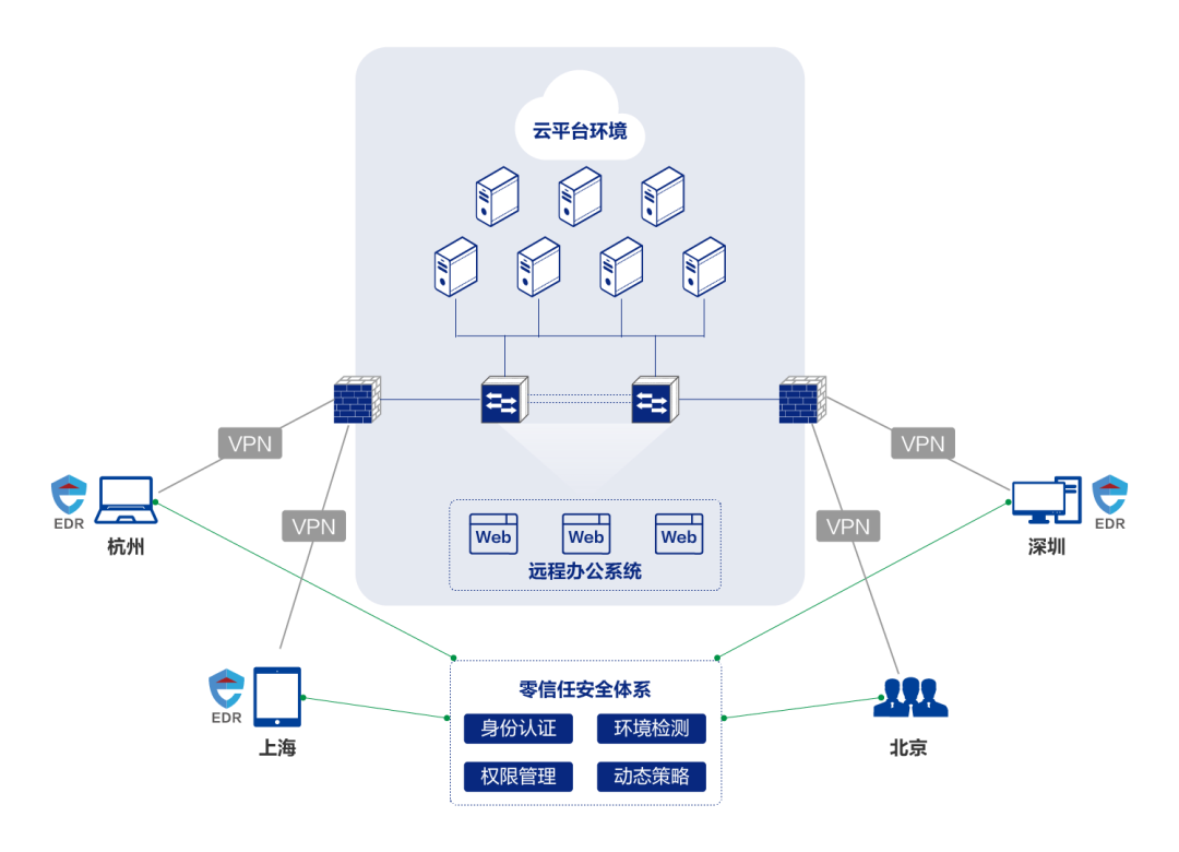 建议:通过建立健全零信任安全体系架构,辅以VPN和主机安全(EDR)等专有安全措施,对远程接入终端和环境的进行安全检测和评估,对存在安全风险的终端系统进行病毒查杀和加固,不可信的终端(如安全分值低于80分值)将不允许远程接入办公系统。从整体上加强对远程接入访问用户的全生命周期管理和最小化权限控制,动态生成远程用户的接入访问和行为模式,保证远程终端的安全可信,将远程连接进行加密,保证数据在传输过程中不被第三方窃取。
