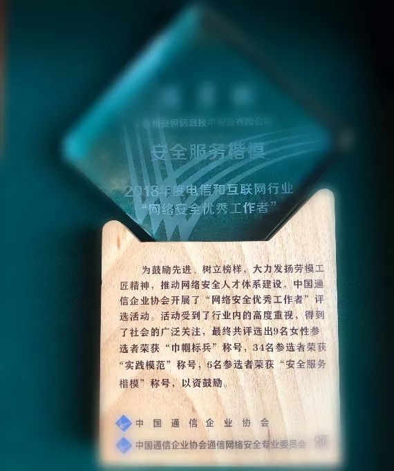 在2019年(第九届)电信和互联网行业网络安全年会上,安恒信息还取得了中国通信企业协会颁发的“网络安全风险评估一级”资质。此资质的取得无疑将进一步助推安恒信息在通信行业更好地开展网络安全风险评估工作。此外,安恒信息安服团队成员还获得了2018年度电信和互联网行业“网络安全优秀工作者”——“安全服务楷模”的称号。