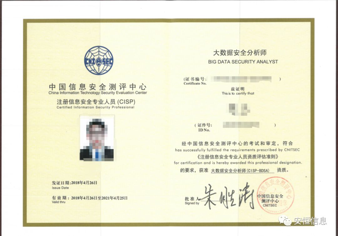 安恒信息是国家信息安全测评中心认定的“CISP授权培训机构”之一,是CISP-ICSSE、CISP-BDSA、CISP-CSE培训的唯一授权运营机构。2017年“西湖论剑”期间,国测联合安恒信息举行网络空间安全人才培养战略合作发布仪式,正式启动CISP-ICSSE、CISP-BDSA和CISP-CSE三大认证项目。