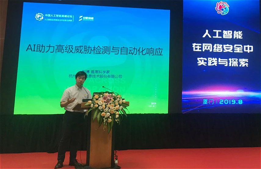在“人工智能在网络安全中实践与探索”论坛上,安恒信息首席科学家、高级副总裁刘博发表了《人工智能助力高级威胁检测与自动化响应》主题演讲。