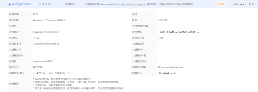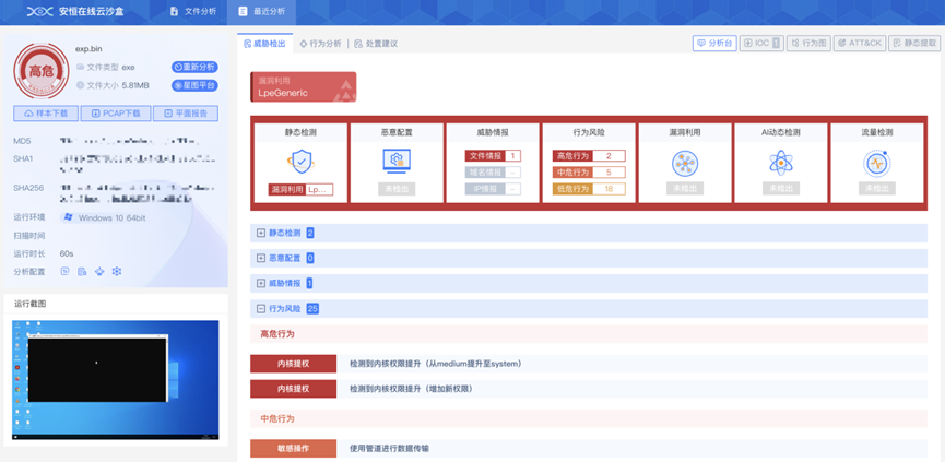 安恒信息沙盒引擎通用内核提权检测框架能够对其进行检测,用户可以通过以下链接查看效果: