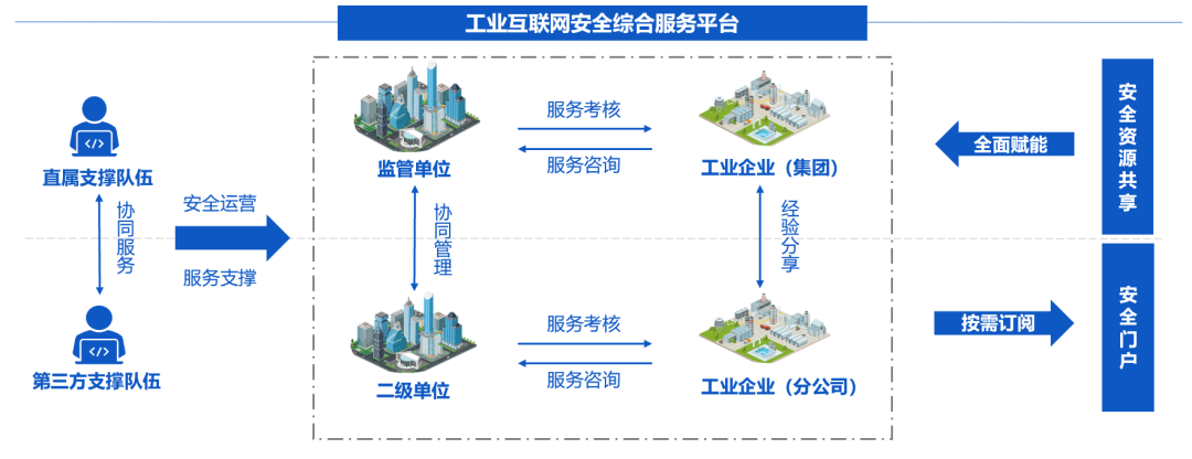 建立主管部门与工业企业的安全服务沟通桥梁,组建省、市\工业园区综合安全公共服务资源池,引导工业企业自主选择相关服务,实现快速“对症下药”;提供安全知识共享服务社区,分享安全防护管理与技术经验,形成形成面向主管部门和工业企业的双向赋能服务机制。