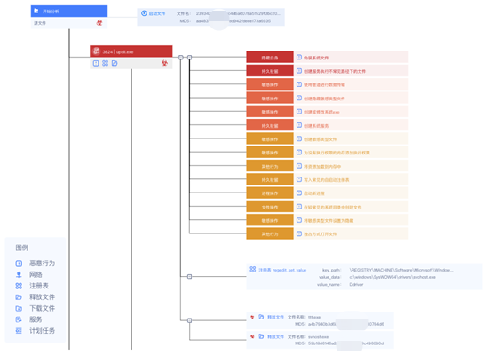 高级行为图将关键行为以图的形式展示,能够直观高效地表现样本运行过程中的关键行为操作,分析每个进程中产生了什么恶意行为、访问了什么网络、修改了什么注册表、释放了什么文件、下载了哪些内容、服务,以及计划任务又做了哪些变化。