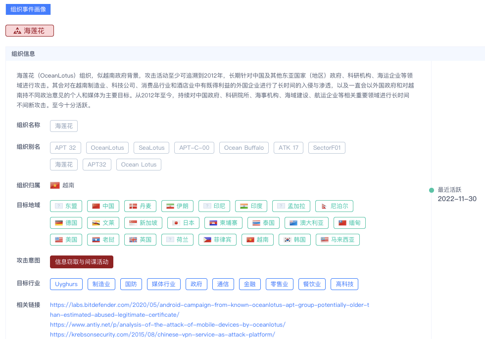 通过多项行为以及组织特征锁定威胁组织。提取组织介绍、别名、组织归属、攻击目标地域、首次出现、最近活跃、攻击意图、目标行业、参考链接等组织关键信息。