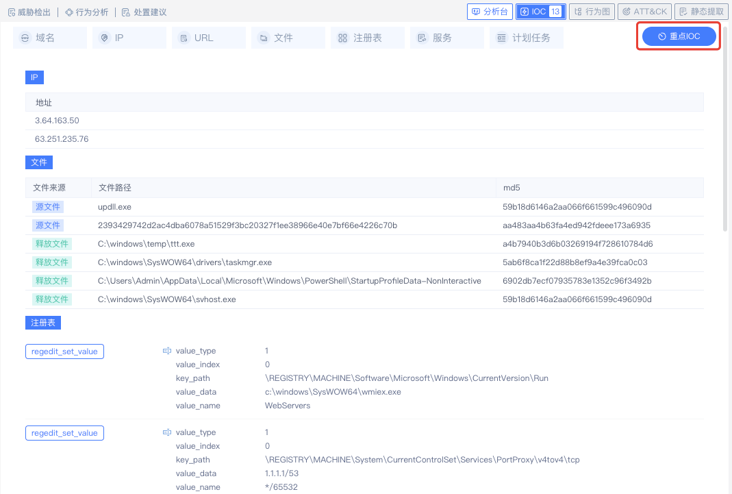IOC分析结果包括域名、IP、URL、文件、注册表、服务、计划任务等核心内容。安恒云沙箱集成安恒海量精准威胁情报数据,让研判证据更充分,同时大幅提升综合检测效能!