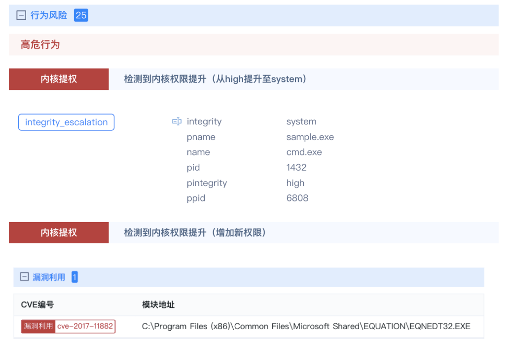同时,安恒云沙箱基于内核提权流程、表现效果、关键证据等行为考量,制定了一套通用检测解决方案,能够不基于特定漏洞,以通用模式即可检测出内核提权。