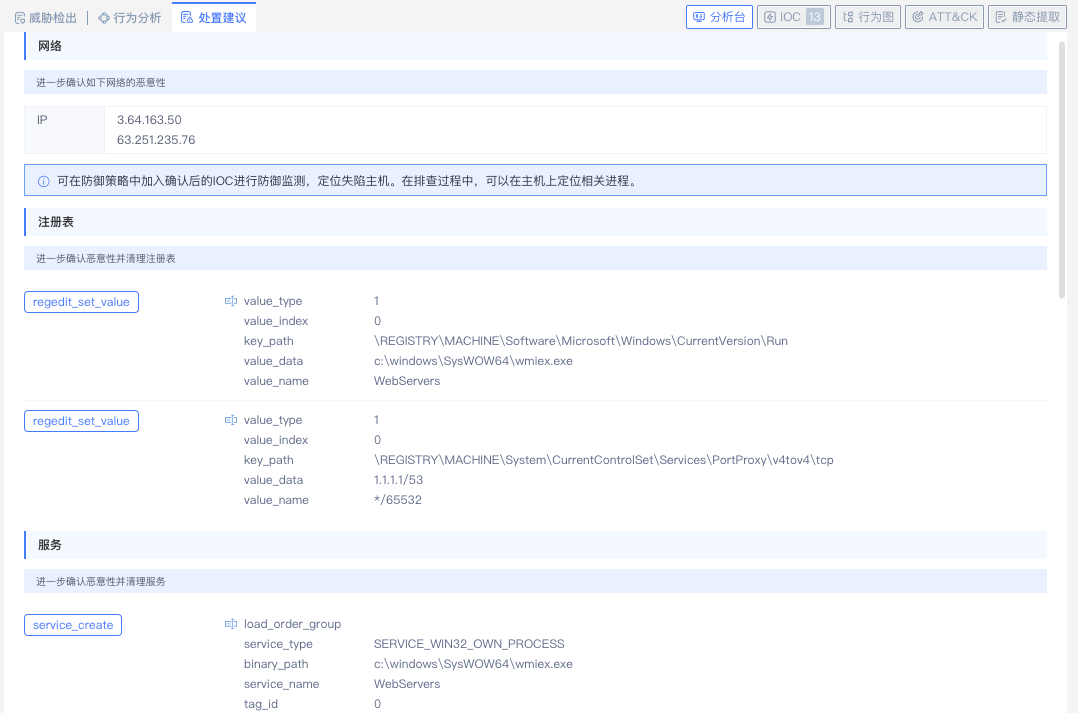 分析后,云沙箱还会提供处置建议,助力实现综合防护,能够在安全运营、应急处置等多种使用场景下提供可实施操作的关键信息,辅助安全运营人员进行快速分析和鉴别。