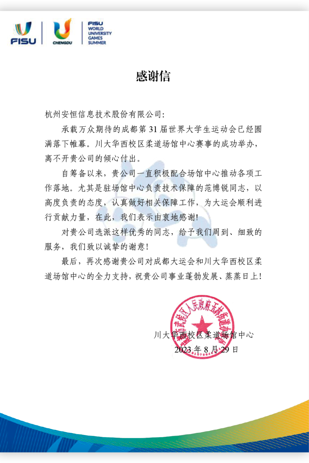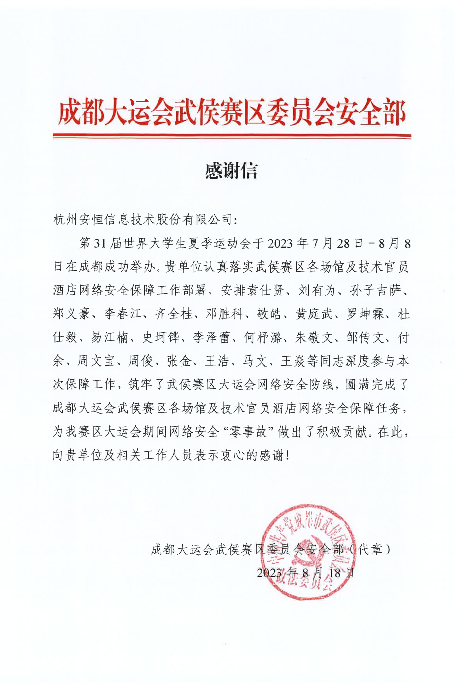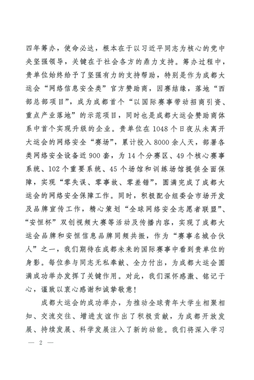 在成都市委市政府及成都大运会执委会感谢信中,对于此次安恒信息在成都大运会以赛谋城、网络安全保障、市场开发、品牌传播等角度给予高度评价,并期待“作为‘赛事名城合伙人’之一,在成都未来的国际赛事中看到安恒信息的身影。”