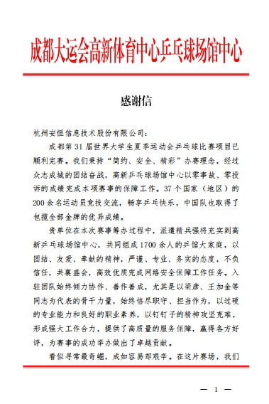 凭借专业的技术和服务,成都市委市政府及成都大运会执委会等多个单位向安恒信息陆续发来感谢信,对其在成都大运会网络安全保障表示诚挚感谢。感谢信全文如下: