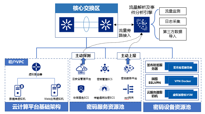 ■ 流量监测:通过密码探针旁挂于核心交换机,解析旁路流量中加解密、签名验签等密码调用数据。