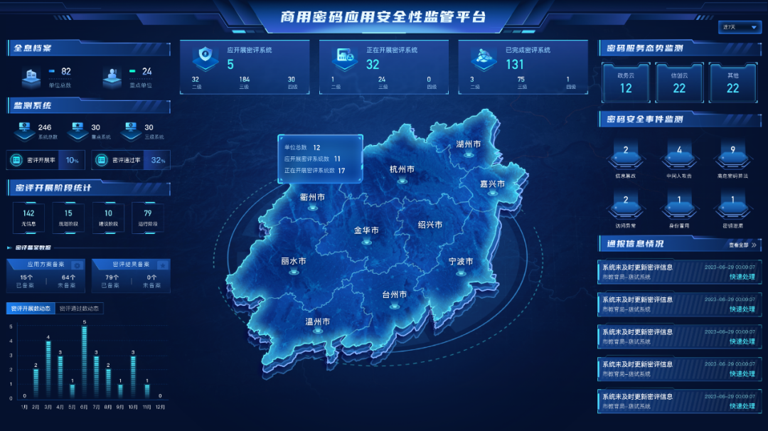 以云平台和云租户系统过密评为例:密码监管平台汇总资产、密码服务状态、事件告警、云租户应用系统密评进度等信息,利用态势感知技术提供的数据分析和可视化能力,统一展示密码安全态势信息。