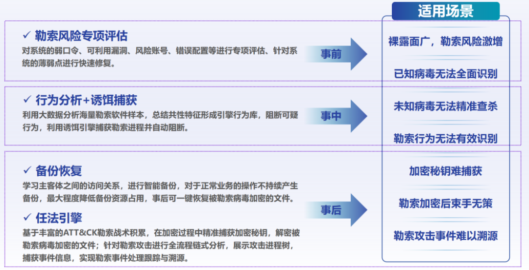 实际上,各类安全产品的零散部署并不能解决现代勒索病毒攻击,大多数的勒索事件,究其根因,往往是在勒索事件发生前期,没有做到病毒识别和预警。