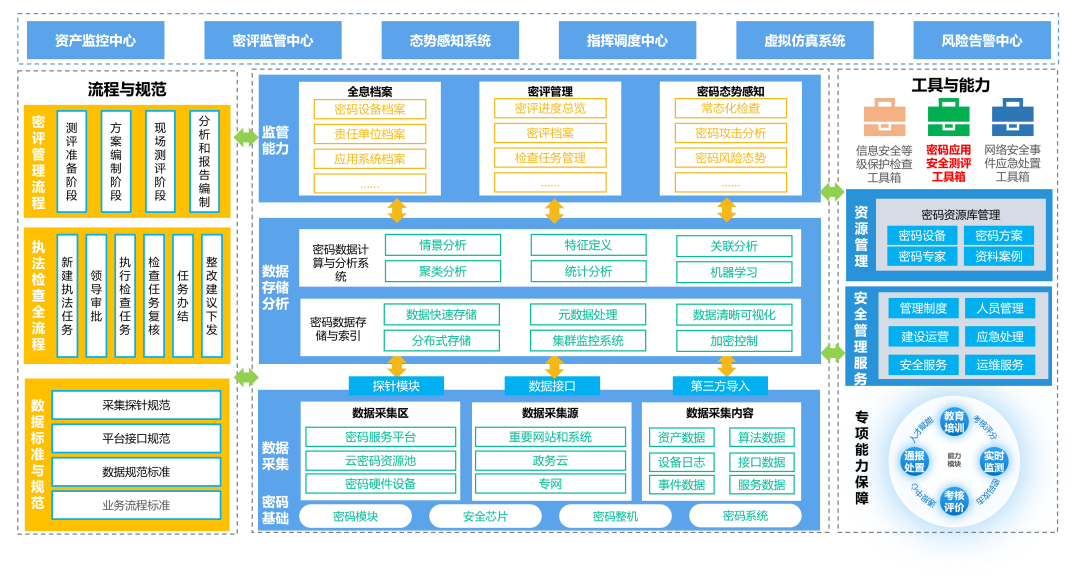 方案以密码应用安全监管平台为核心,整体遵循“分层解耦、异构兼容”的原则,各功能模块之间具有相对独立性,从而保证整个系统的高扩展性。平台通过对密码算法、密码服务、应用环境等多维度的多源异构数据进行采集分析,为上层应用提供大数据支撑;