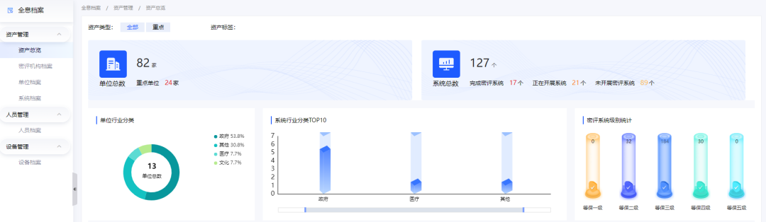 对此密码应用安全监管平台为用户提供全息档案功能,可对本辖区内的责任单位、信息系统、密码资产、密评机构、密码厂商等五类信息进行录入管理和综合展示。五类档案相互关联、信息联动,能够展示当前阶段各等级应用系统所使用的密码产品、密码服务和业务系统密评备案的详细信息。全息档案为密码管理部门开展密码监管工作提供数据基础能力,在此基础上联动其他功能模块,建立密码监管的全局视野。