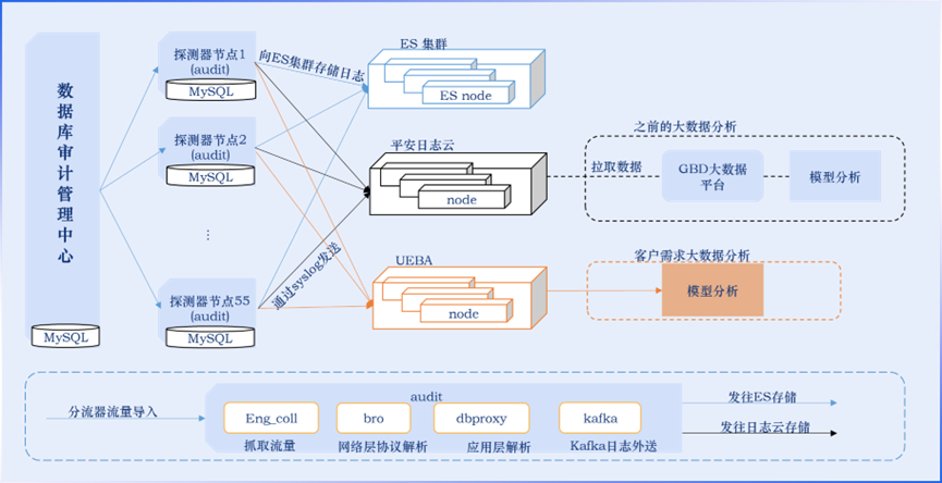 针对上述挑战,安恒信息经过深入调研,为客户量身定制了分布式解决方案,并结合用户的ES存储集群,创建了专为大型企业设计的数据库审计模式: