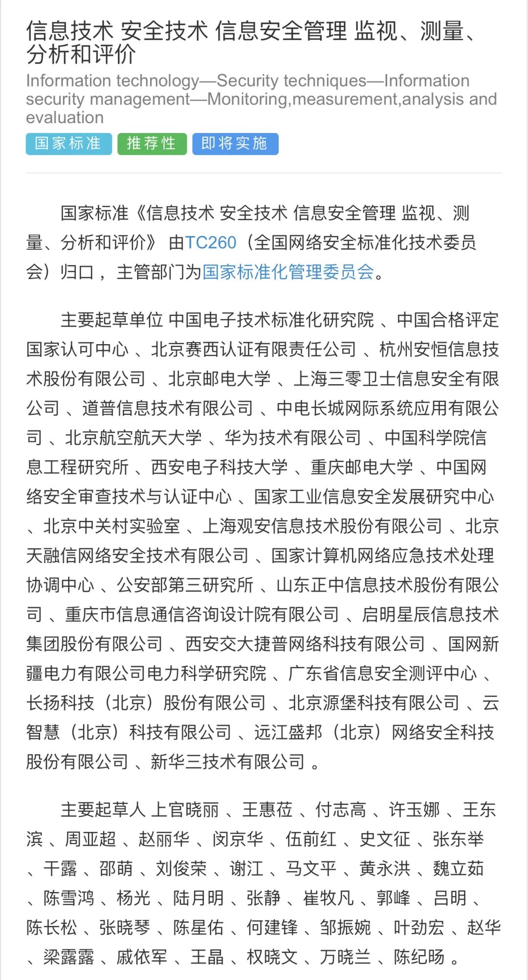 GB/T 31497-2024《信息技术 安全技术 信息安全管理 监视、测量、分析和评价》等同采用国际标准ISO/IEC 27004:2016《信息技术 安全技术 信息安全管理 监视、测量、分析和评价》,代替GB/T 31497—2015《信息技术 安全技术 信息安全管理 测量》。该标准规定了信息安全绩效的监视和测量、信息安全管理体系(包括其过程和控制)有效性的监视和测量以及监视和测量结果的分析和评价,旨在帮助组织评价信息安全绩效和信息安全管理体系的有效性。