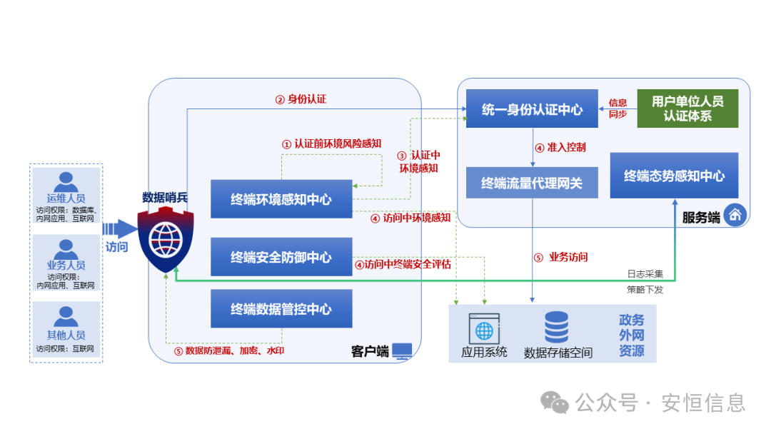 当运维人员、业务人员及其他人员通过终端访问政务应用和政务数据时,通过数据哨兵的五大中心,按照下图流程进行安全保障,全程采取“人员+环境”的双保险机制,落实终端数据安全防护和监管措施,确保访问的终端安全和终端的访问安全。