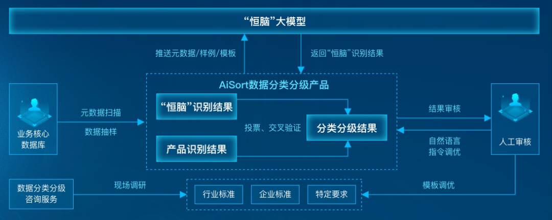 安恒信息作为业内首家分类分级产品结合大模型进行落地的厂商,将数据分类分级交付效率提升了30倍。利用大模型百亿级别参数及海量行业数据,可以覆盖所有行业的分类分级工作,相比之前的技术手段,可以更精确识别数据含义及给出分类分级结果,并且能够从业务视角自动解释分类分级结果的依据。同时能以一句话形式的自然语言指令注入专家经验,让大模型按照用户期望批量调整结果,无需再写复杂的规则,易用性大幅提升。