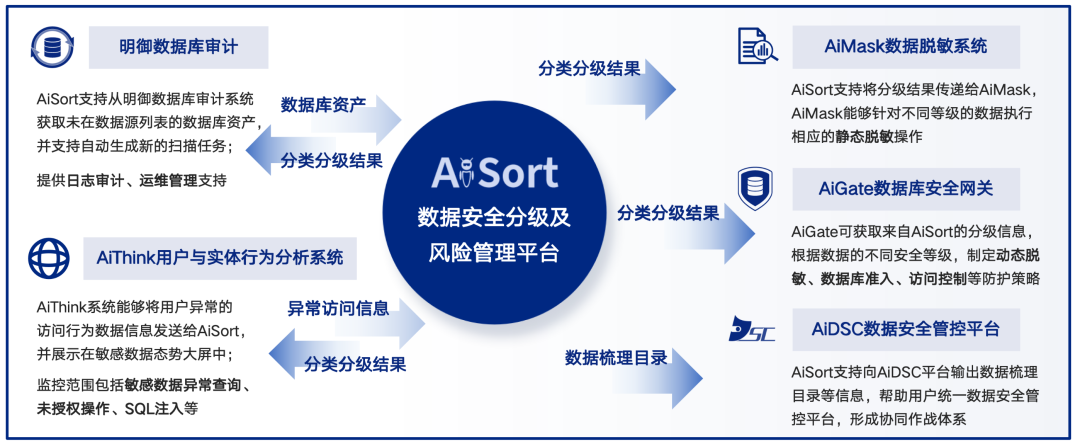 与此同时,AiSort分类分级工具已经和安恒多款数据安全产品实现分类分级结果联动,无需进行二次开发,即可实现精细化的数据安全监测、预警、管控,共同构成了一道更加严密和全面的数据安全防线。