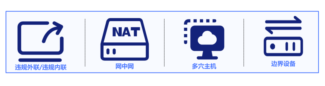 通过非侵入式监测技术,而非桌面客户端模式,精准发现金融物联专网中一机两用、违规外联、违规内联、网中网、多网卡、4G网卡、无线网卡等破坏网络边界完整性的高危行为。
